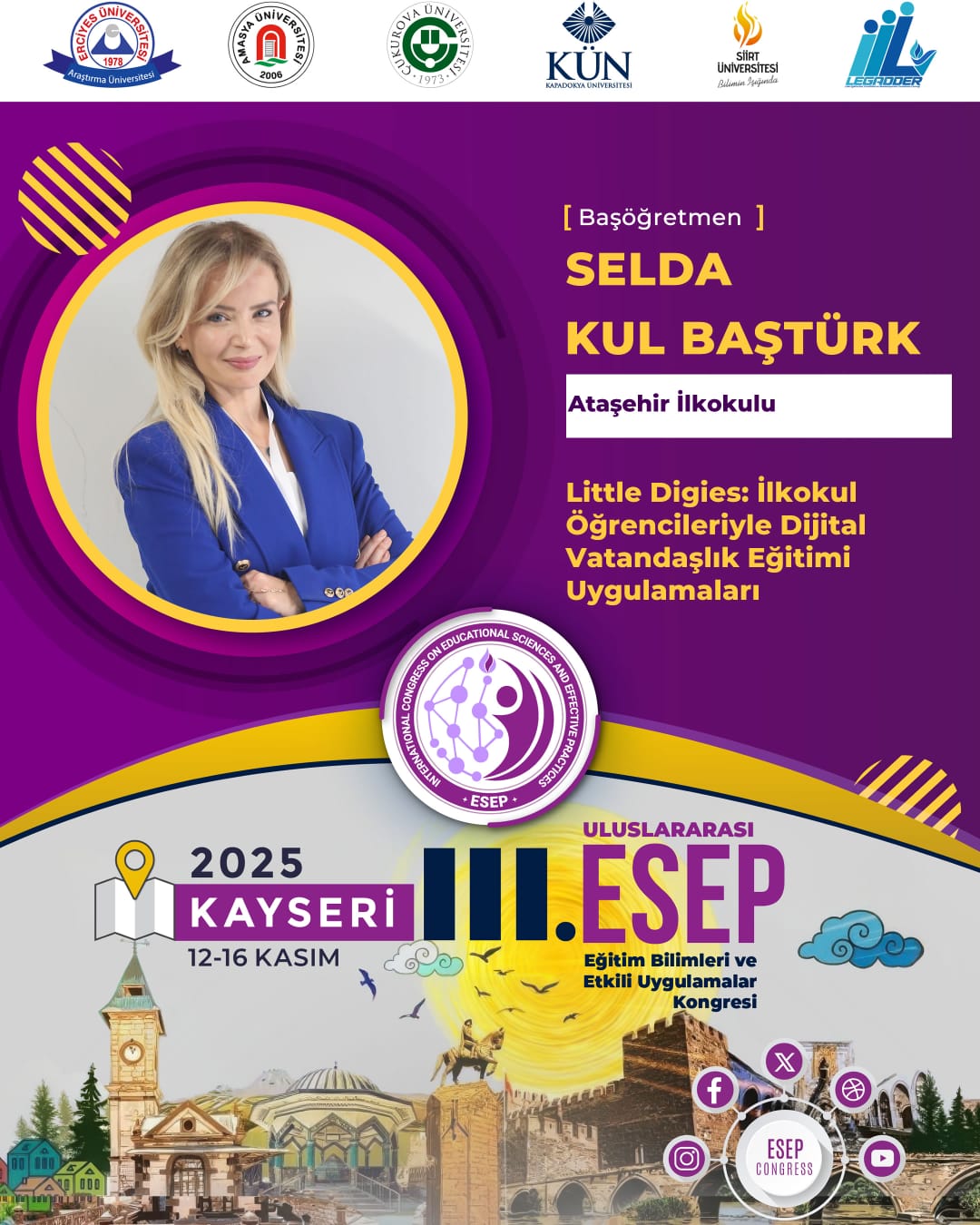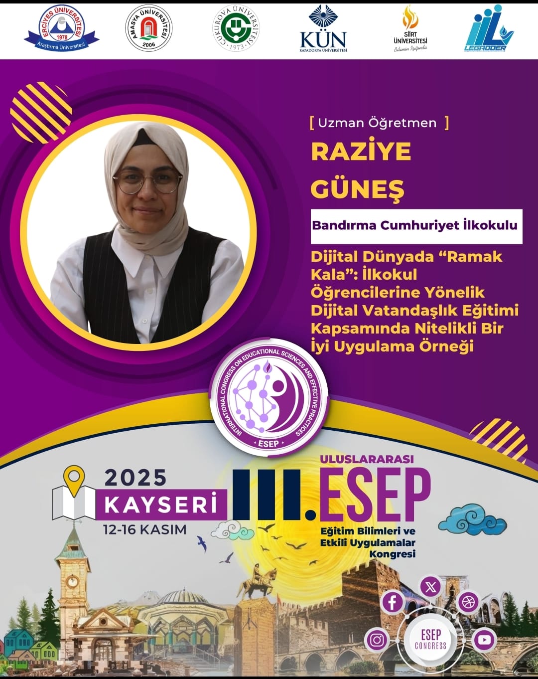 12-14 Kasım tarihlerinde Kayseri Erciyes Üniversitesi’nde düzenlenen III. Uluslararası ESEP Kongresi kapsamında, Balıkesir Bandırma Cumhuriyet İlkokulu ve İstanbul Ataşehir İlkokulunda yürütülen çalışmalarımız akademik alanda sözlü bildiri olarak tanıtıldı. Koordinatörlerimiz tarafından “Dijital Dünyada Ramak Kala: İlkokul Öğrencilerine Yönelik Dijital Vatandaşlık Eğitimi Kapsamında Nitelikli Bir İyi Uygulama Örneği” ve “Little Digies: İlkokul Öğrencileriyle Dijital Vatandaşlık Eğitimi Uygulamaları” adlı bildiriler sunuldu.
